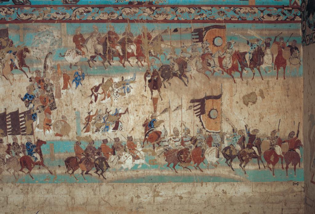 在莫高窟第249窟,有一幅经典的狩猎图。猛虎追赶骑马猎人,就在老虎前扑的一刹,猎人转身对准猛虎拉弓搭箭,马儿则扬起前蹄,这充满远古气息的紧张瞬间被古代画工定格。这种骑马者回身开弓的技法被称为“帕提亚式射箭”,最早出现在西亚,后传入中国,成为山水画的有机组成部分。