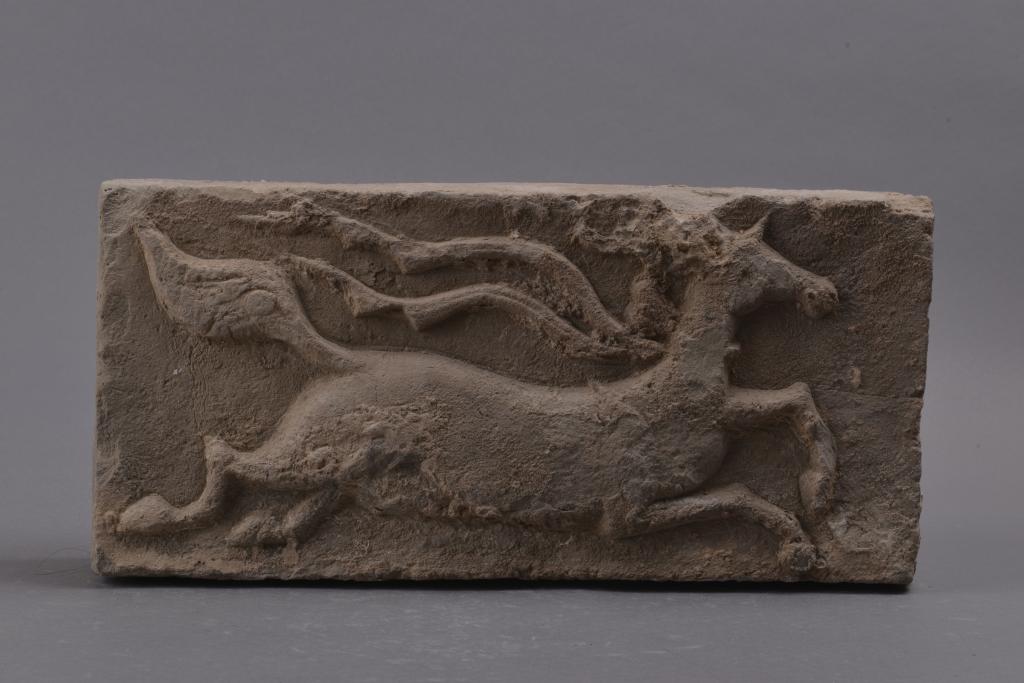 敦煌市三危山老君堂出土的天马砖也是一级文物。砖上有一匹高浮雕马,它昂首扬颈,颈系飘带,四足腾空,长尾飘起。马雪丽说,这件文物使用模印技法制作,反映出唐代精湛的工艺。