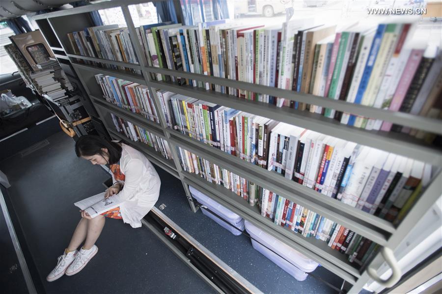 A young woman reads a book on a mobile library van in Huanggang City, central China's Hubei Province, Sept. 5, 2017. More than 100 mobile library vans have served readers across the province since 2012. (Xinhua/Xiao Yijiu)?