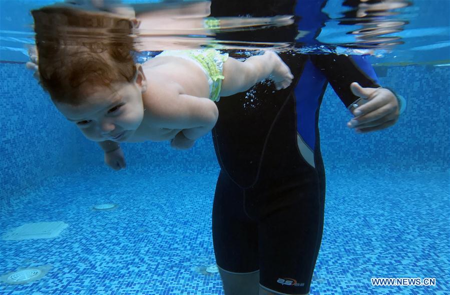 An infant swims with a trainer in Cairo, Egypt on Jan. 16, 2018. At a small closed and ceiled hygienic swimming pool in a language school on the outskirts of Cairo, a dozen of parents took their babies to attend the special swimming classes in the unique center run by international baby swimming coach Mohamed Abdel-Maksoud. (Xinhua/Ahmed Gomaa)