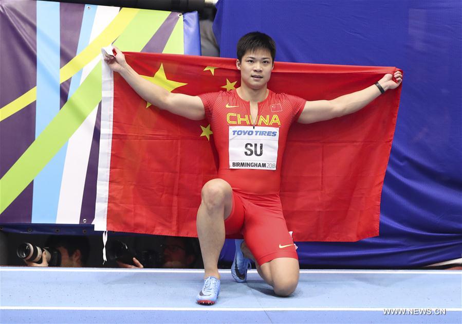 BIRMINGHAM, March 3 (Xinhua) -- Su Bingtian became the first male Chinese sprinter to win a global medal in an individual event as he took the silver in the men's 60 meters final at the World Indoor Championships here on Saturday.