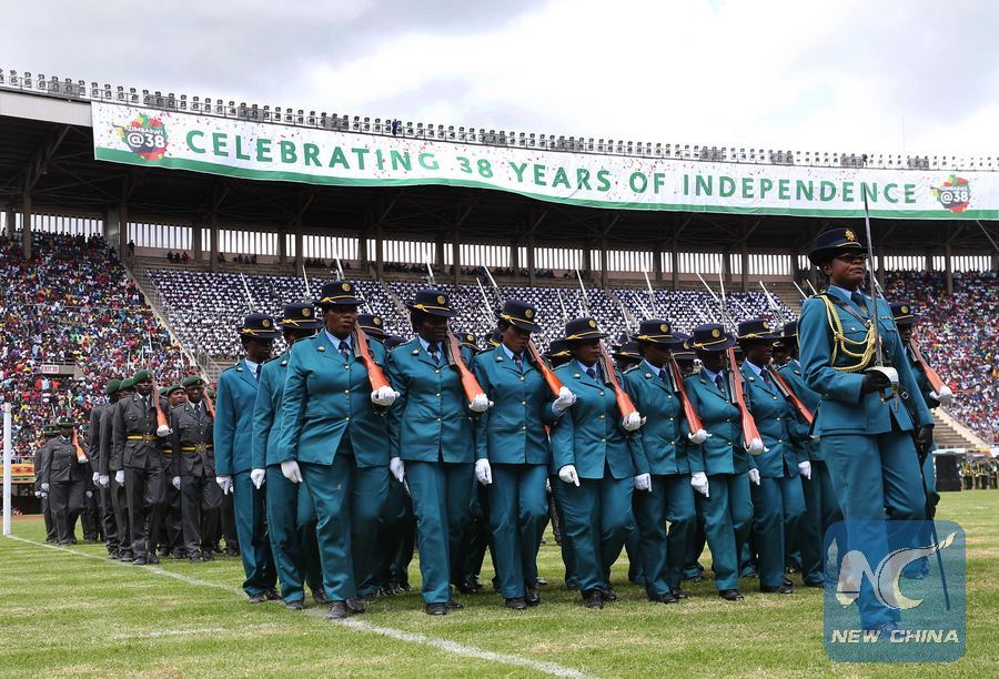 Zimbabwean soldiers get ready for inspection during a celebration marking the nation's 38th independence anniversary at the National Sports Stadium in Harare, Zimbabwe, April 18, 2018. (Xinhua/Shaun Jusa)