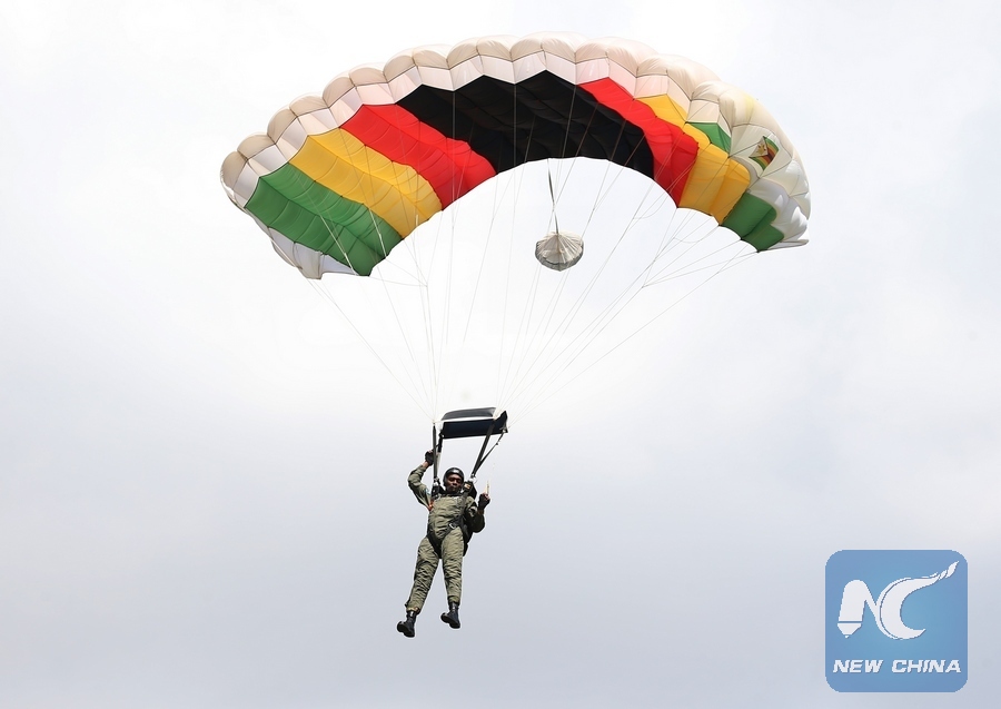A Zimbabwean air force soldier gives parachuting performance during a celebration marking the nation's 38th independence anniversary at the National Sports Stadium in Harare, Zimbabwe, April 18, 2018. (Xinhua/Shaun Jusa)