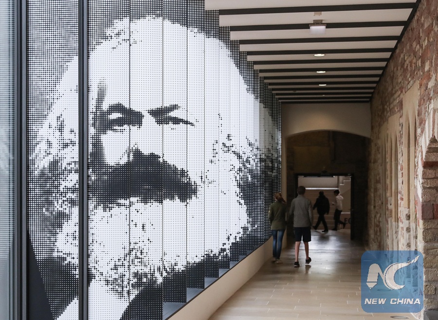 Photo taken on May 3, 2018 shows the entrance of the exhibition "Karl Marx 1818-1883. Life. Work. Time." in the City Museum Simeonstift Trier in Trier, Germany. (Xinhua/Shan Yuqi)