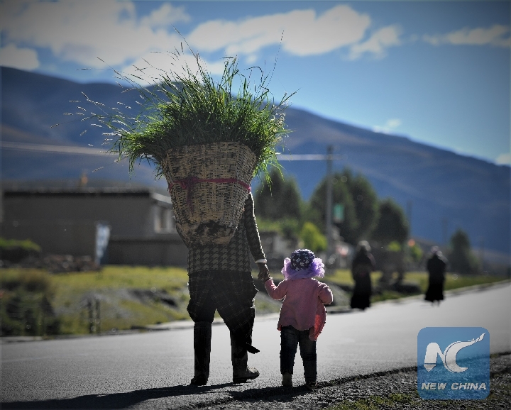 A woman carrying forage grass on her back is seen with her daughter in Dingri County in Xigaze, southwest China's Tibet Autonomous Region, Sept. 13, 2018. (Xinhua/Purbu Zhaxi)