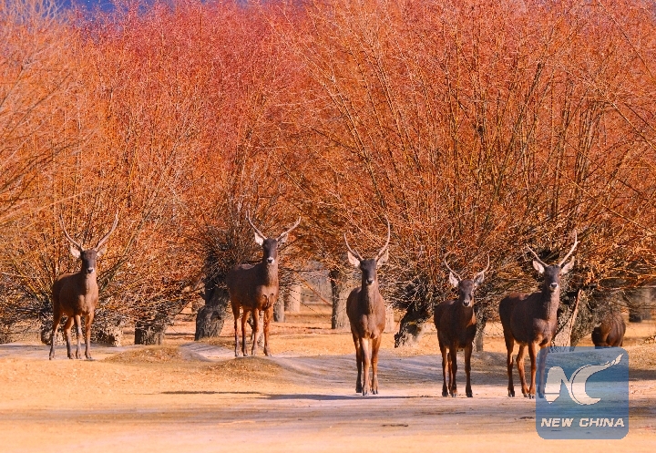 Photo taken on Jan. 6, 2018 shows red deers in a forest of the nature reserve in Shannan City of southwest China's Tibet Autonomous Region.(Xinhua/Zhang Rufeng)