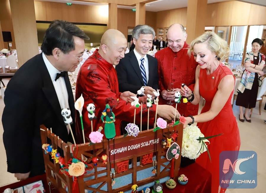 A Chinese chef (2nd L) shows the dough figurines he made at "Confucius Institute Banquet -- A Taste of Sichuan" in Dublin, Ireland, May 15, 2019. (Xinhua/Liu Xiaoming)