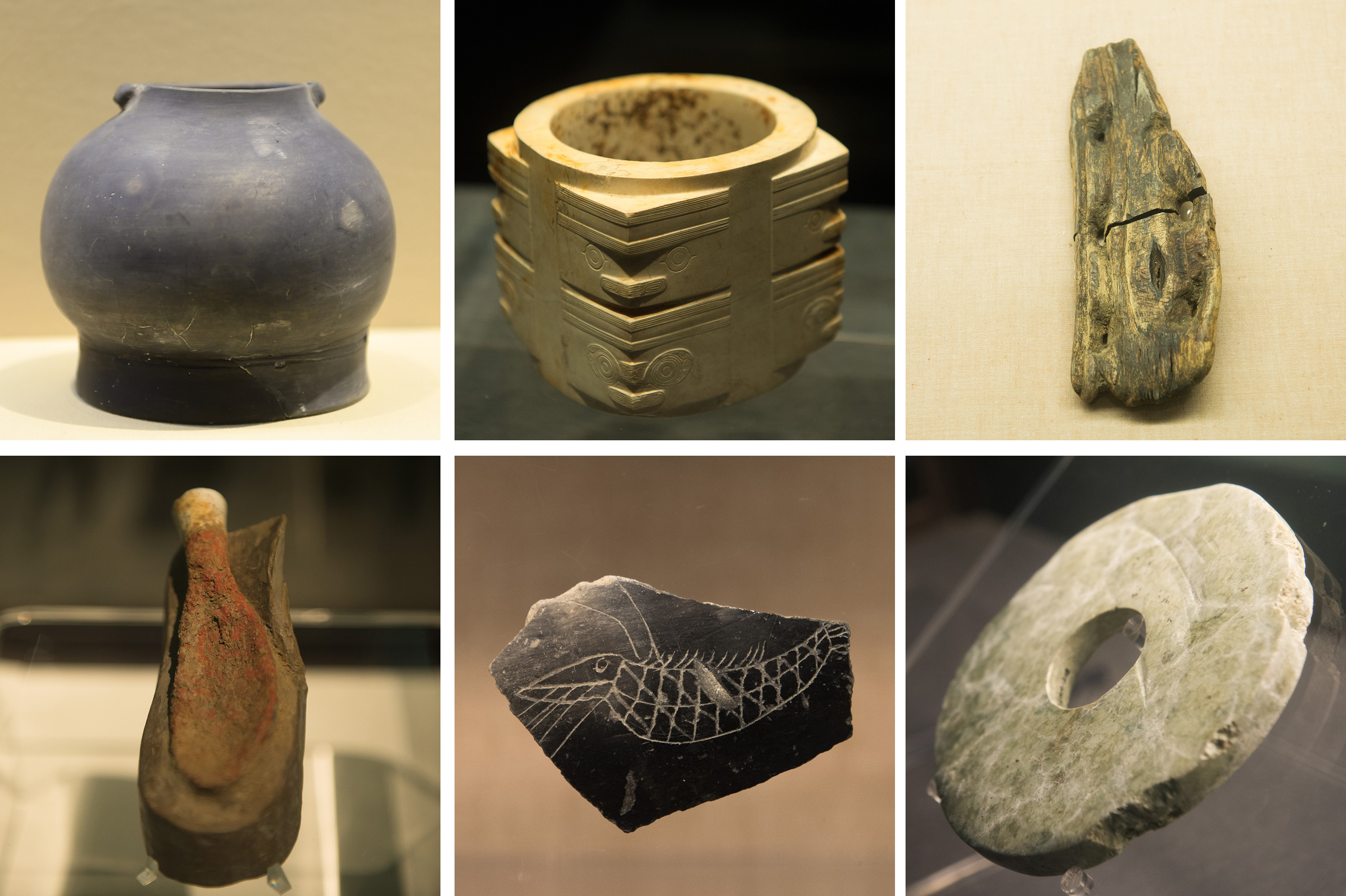 Combo photo shows artifacts excavated from the Liangzhu relic site in Hangzhou. (Xinhua/Weng Xinyang)