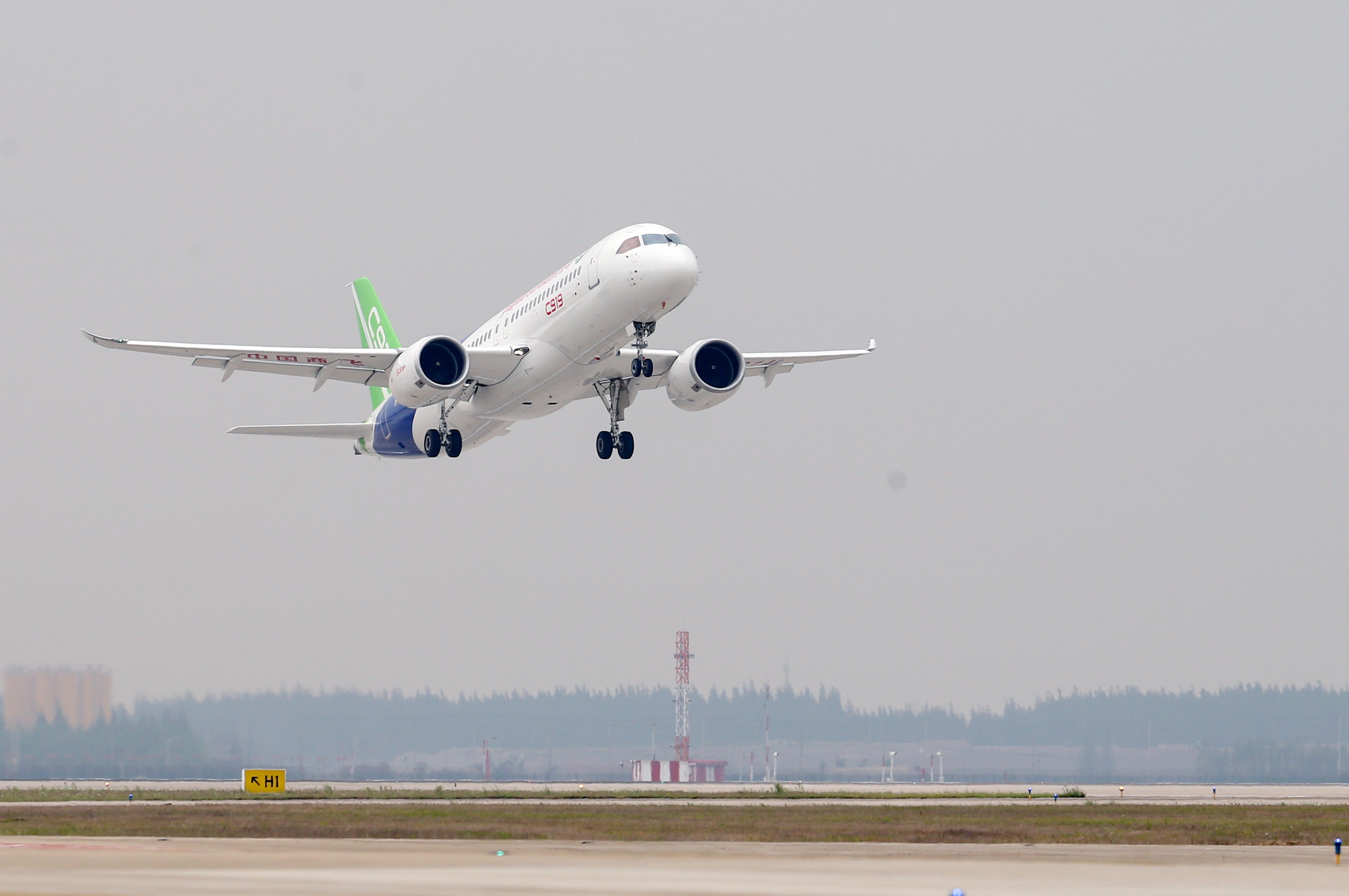 The twin-engine C919 is China's first homegrown trunk jetliner. With the project started in 2008, the C919 airplane conducted a successful maiden flight on May 5, 2017.