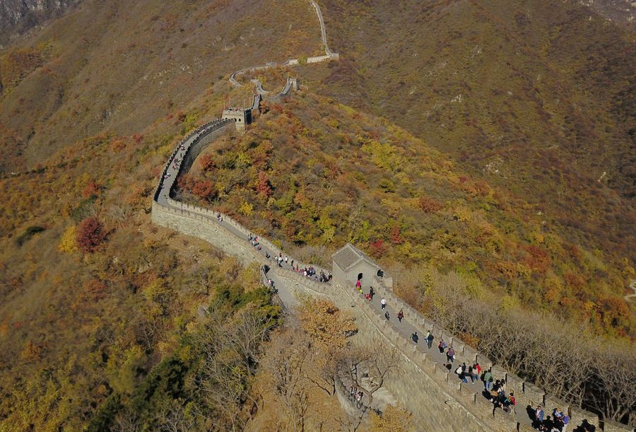 Aerial photo shows autumn scenery at the Mutianyu Great Wall in Beijing, Nov. 4, 2019. (Xinhua/Chen Zhonghao)