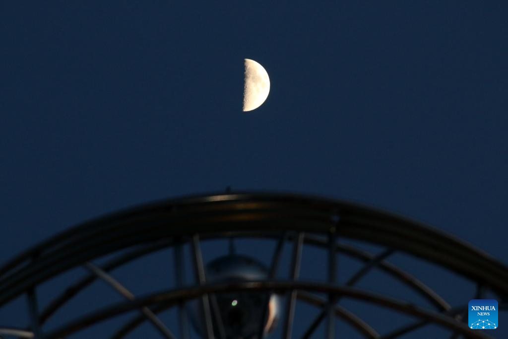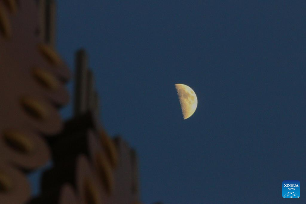 This photo taken on Feb. 24, 2026 shows the moon over Harbin City, northeast China's Heilongjiang Province. The largest first quarter moon of the year appeared in the sky on Tuesday. The moon was near its perigee in orbit, approximately 370,000 kilometers from the Earth. (Photo by Zhang Shu/Xinhua)