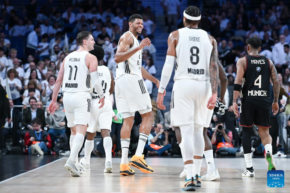 Real Madrid's players celebrate during the Euroleague basketball match between Real Madrid and Bayern Munich in Madrid, Spain, on Feb. 26, 2026. (Photo by Gustavo Valiente/Xinhua)