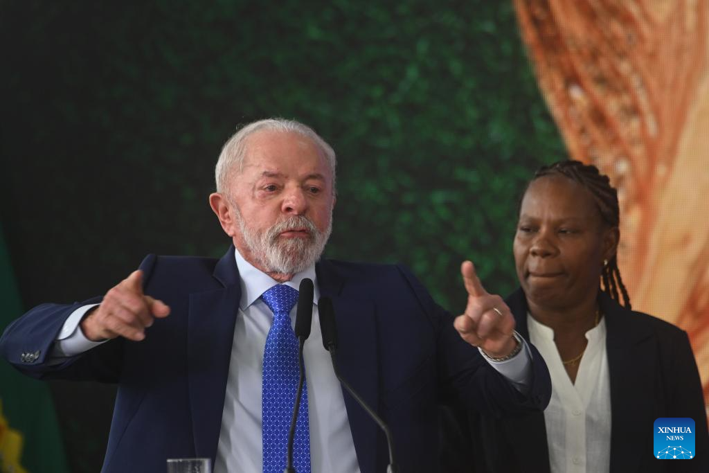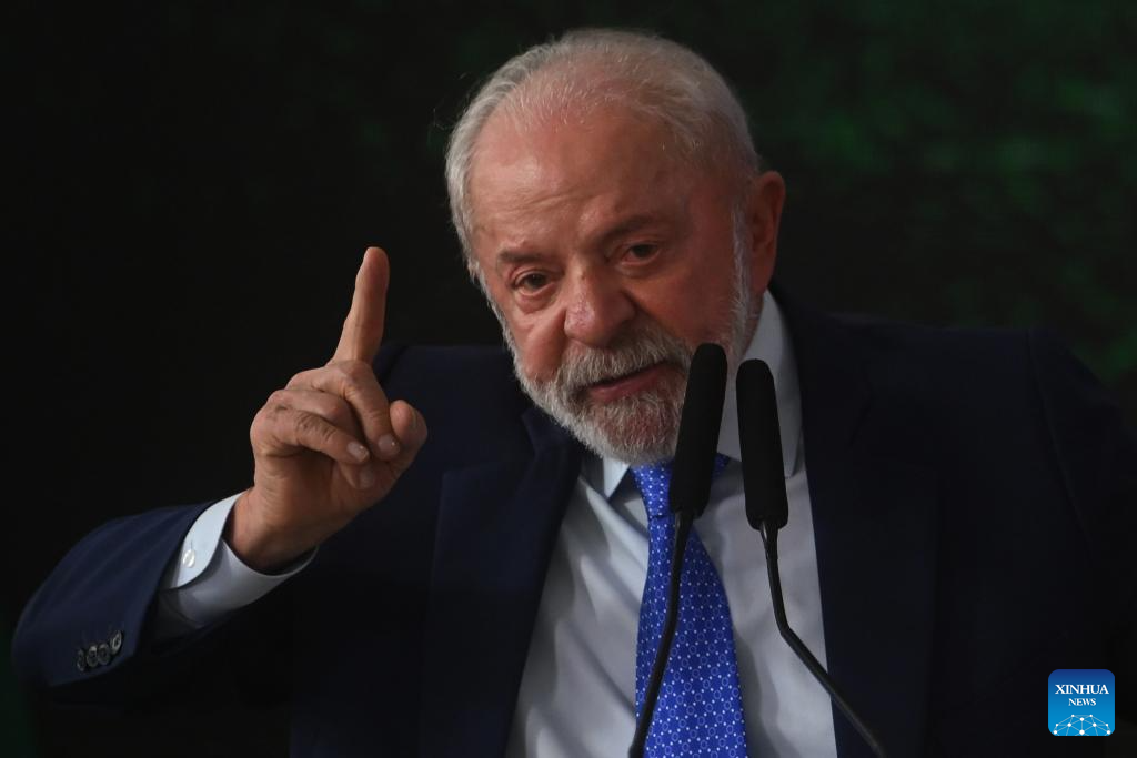 Brazilian President Luiz Inacio Lula da Silva speaks during the FIFA World Cup Trophy Tour ceremony at the Planalto Palace in Brasilia, Brazil, Feb. 26, 2026. (Photo by Lucio Tavora/Xinhua)