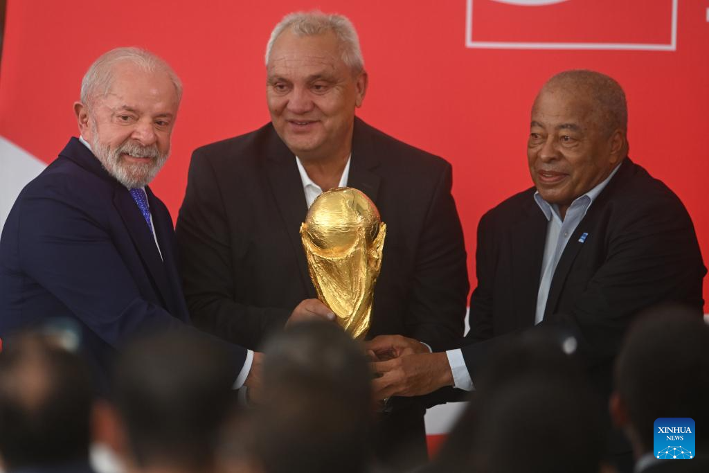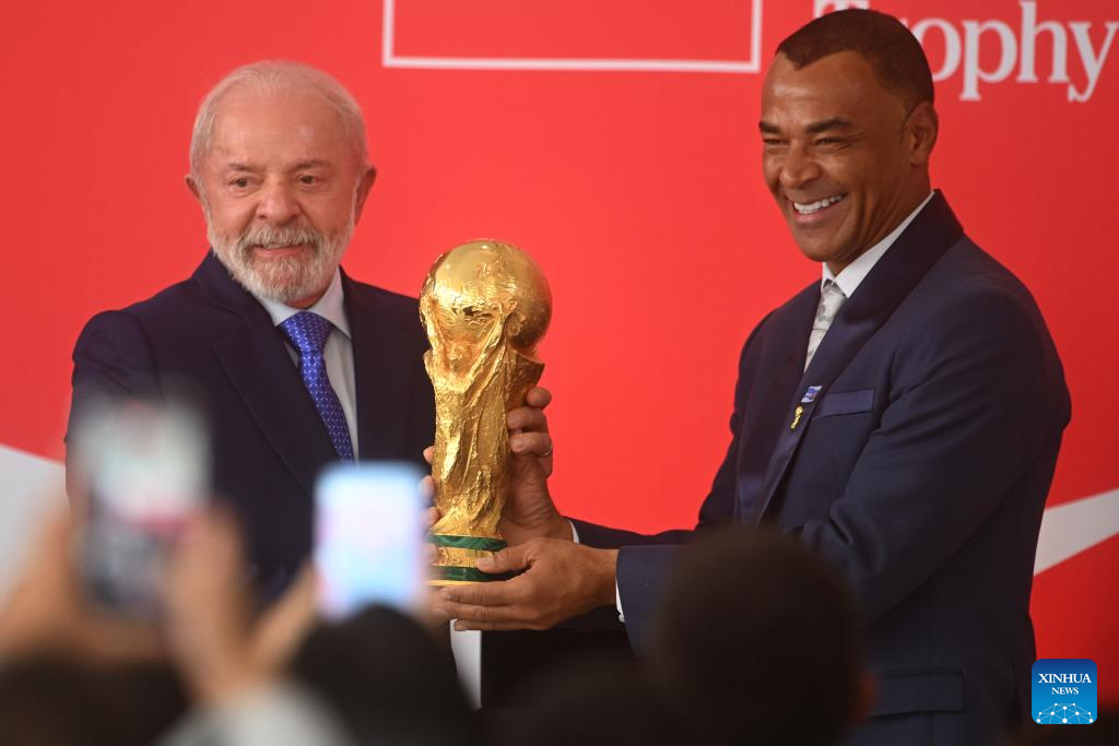 Brazilian President Luiz Inacio Lula da Silva (L) and former Brazilian national team player Cafu hold the World Cup trophy during the FIFA World Cup Trophy Tour ceremony at the Planalto Palace in Brasilia, Brazil, Feb. 26, 2026. (Photo by Lucio Tavora/Xinhua)