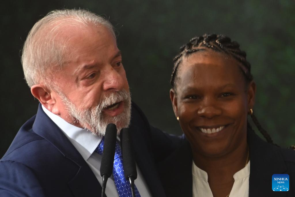 Brazilian President Luiz Inacio Lula da Silva (L) speaks alongside former Brazilian women's national team player Formiga during the FIFA World Cup Trophy Tour ceremony at the Planalto Palace in Brasilia, Brazil, Feb. 26, 2026. (Photo by Lucio Tavora/Xinhua)