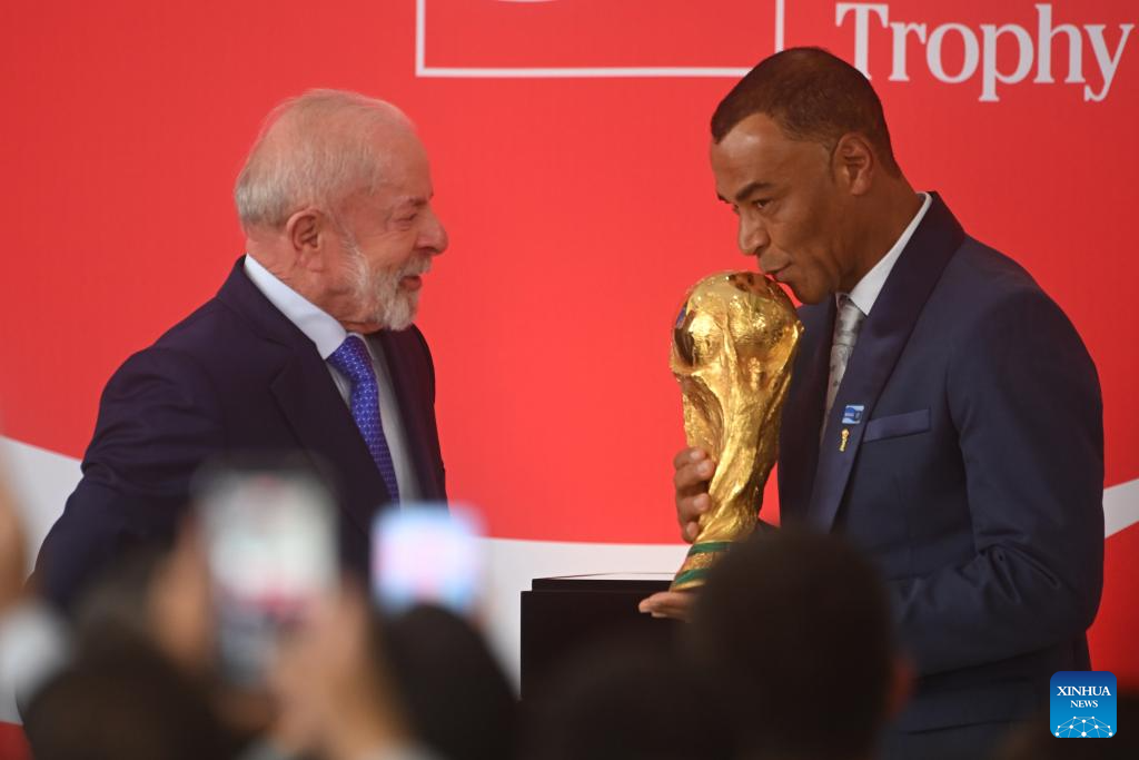 Brazilian President Luiz Inacio Lula da Silva (L) watches the former Brazilian national team player Cafu kissing the World Cup trophy during the FIFA World Cup Trophy Tour ceremony at the Planalto Palace in Brasilia, Brazil, Feb. 26, 2026. (Photo by Lucio Tavora/Xinhua)