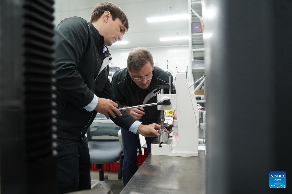 Christopher Praetzas (L) and production director of the company assemble samples at a workshop of CIT (Taicang) Automotive Technology Co., Ltd. in Taicang, east China's Jiangsu Province, on Feb. 25, 2026. (Xinhua/Ji Chunpeng)