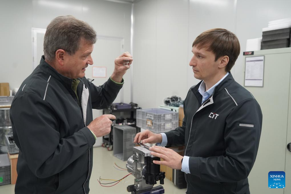 Christopher Praetzas (L) and Jiang Xiaohua discuss product experiments at a precision machining workshop of CIT (Taicang) Automotive Technology Co., Ltd. in Taicang, east China's Jiangsu Province, on Feb. 25, 2026. (Photo by Liu Zhenrui/Xinhua)