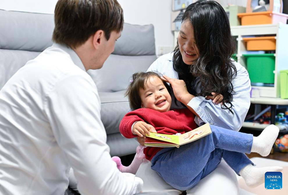 Christopher Praetzas (L) and Jiang Xiaohua play with their daughter at home in Taicang, east China's Jiangsu Province, on Feb. 26, 2026. (Xinhua/Ji Chunpeng)