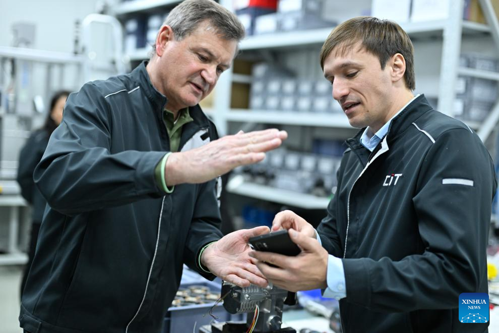 Christopher Praetzas (L) and production director of the company assemble samples at a workshop of CIT (Taicang) Automotive Technology Co., Ltd. in Taicang, east China's Jiangsu Province, on Feb. 25, 2026. (Xinhua/Ji Chunpeng)