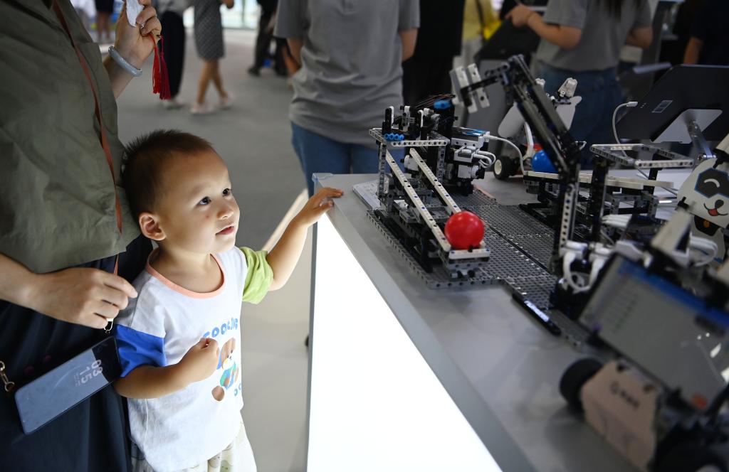 9月11日,在服贸会教育服务专题展区,一名小朋友在猿编程展台观看最新AI教育产品。