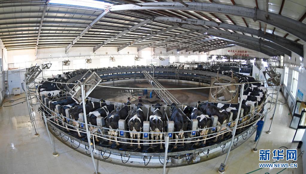 寧夏中衛市沐沙牧場的工作人員為自動轉盤式奶臺上的奶牛擠奶(2020年9月14日攝)。寧夏中衛市沐沙牧場,經過7年時間,改造沙漠近萬畝。昔日數十米高的流動沙丘經過治理改造,變身飼草玉米種植基地,荒蕪的沙地變身“奶牛樂園”。