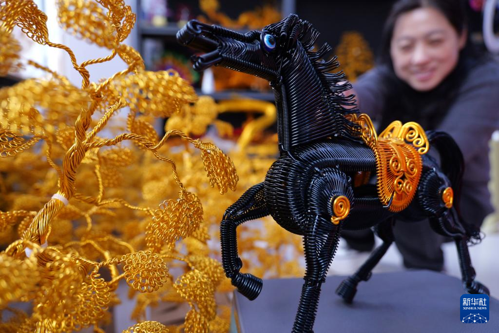 1月16日,在山东省滨州市惠民县辛店镇如康家园,一名铝艺匠人用铝丝制作骏马奔腾造型。