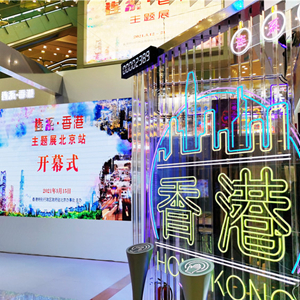 此次主題展展臺外觀通透明亮,內部搭配錯落有致的霓虹招牌,還呈現香港古跡和香港街道的場景,讓觀眾身在北京也能感受到香港豐富多元的都巿面貌,體驗濃厚的“港風”。展覽分為六大主題,包括“香港連接內地與世界的橋梁功能”“商貿金融和創新科技”“多元文藝發展”“薈萃古今中外文化的特色”“綠色城市風光”“京港合作交流”。展臺還設有兩個互動裝置,以富有趣味的方式讓參觀者“連系”香港,并為香港送上祝福。