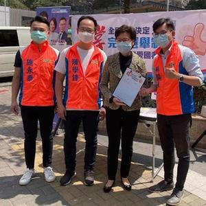 3月15日,香港特區行政長官林鄭月娥(右二)在位于港鐵堅尼地城站的街站展示簽名。新華社發