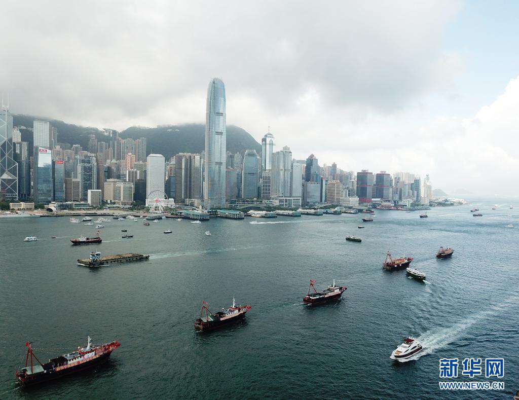 維多利亞港中,上百艘插滿旗幟的漁船緩緩巡游,宛如長龍,蔚為壯觀。尖沙咀碼頭,眾多香港市民唱起國歌,舞動國旗、區(qū)旗,向游弋的漁船致意。船上、岸上,歡呼聲此起彼伏。