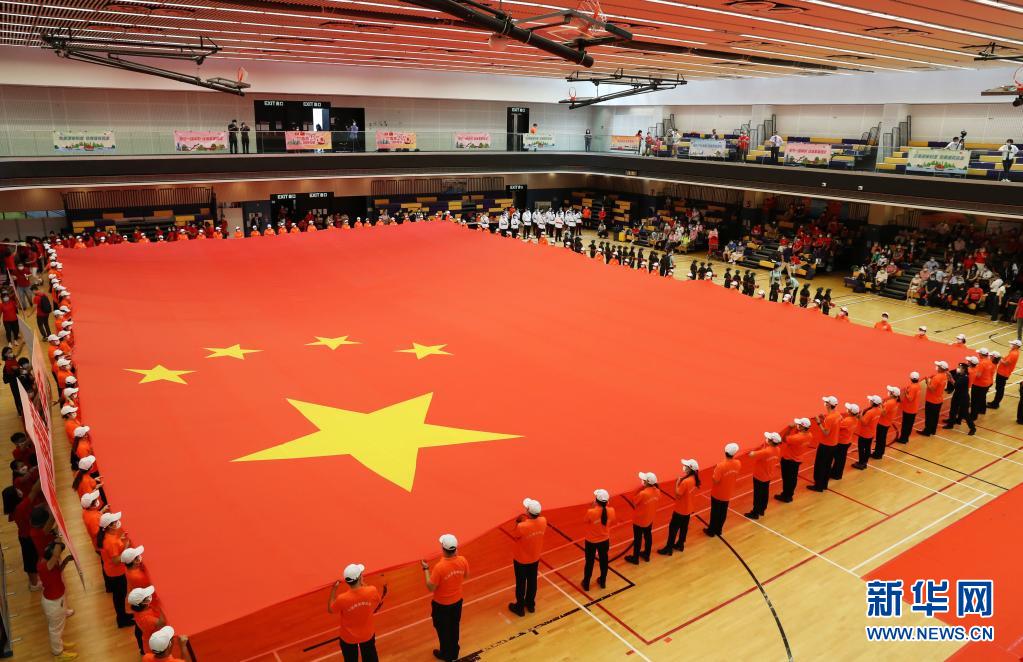 7月1日,在香港坑口體育館,香港市民展示大型國旗。新華社記者 李鋼 攝