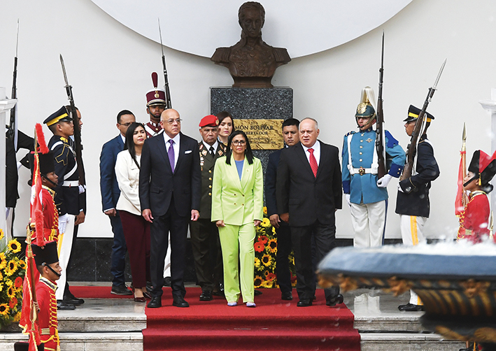 2026年1月15日,在委内瑞拉首都加拉加斯,委内瑞拉代总统德尔西·罗德里格斯(前中)到达会场准备发表国情咨文