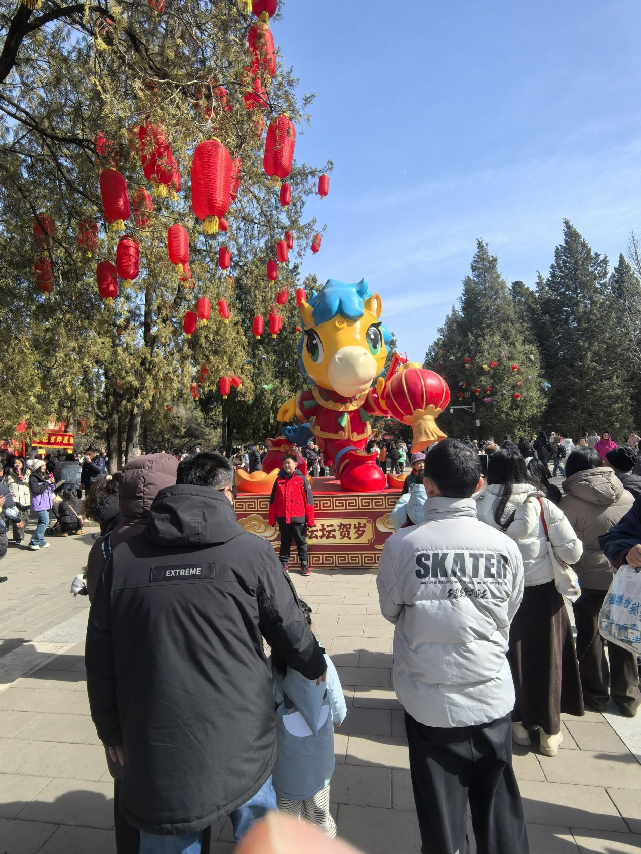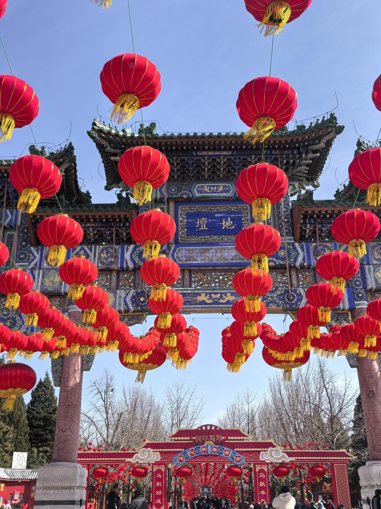 地坛西门牌楼,蓝底金字耀晴空,红灯高挂缀飞檐。