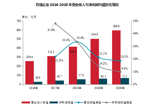 報告指出,百強企業營收與凈利潤保持增長態勢,盈利能力持續下行。百強企業銷售業績的穩步增長帶動其營業收入和凈利潤的持續增加,2020年,百強企業營業收入均值達596.9億元,凈利潤均值達71.5億元,分別同比增長18.3%、9.8%,增速較上年減少2.8、4.4個百分點。百強企業凈利潤率、凈資產收益率均值分別為11.2%、14.4%,同比降低0.7、1.0個百分點。