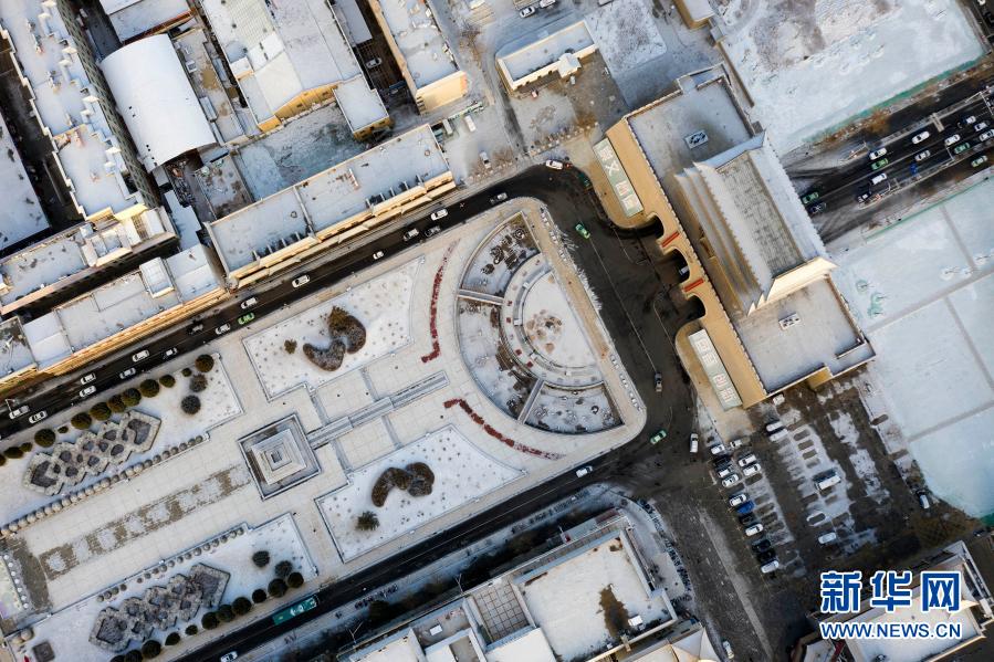 3月1日拍攝的雪后甘肅省武威市南城門廣場(無人機照片)。新華社發(姜愛平 攝)