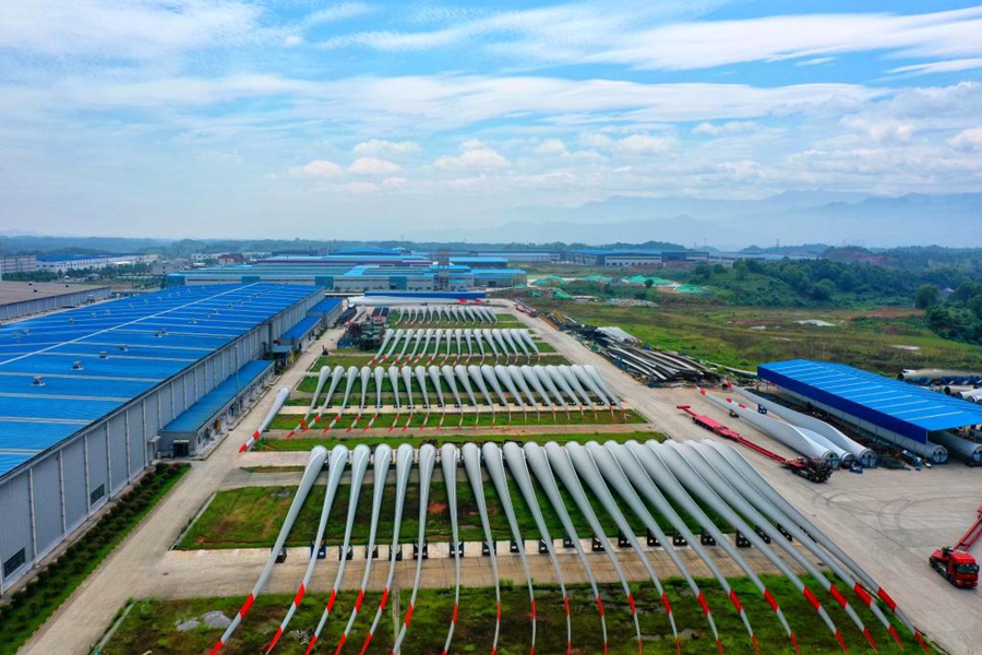 大型風電葉片生產(chǎn)企業(yè)中材科技(萍鄉(xiāng))風電葉片有限公司航拍景象。(王強攝 新華社通聯(lián)照片)