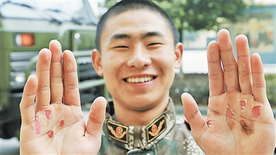 ??? 武警四川省總隊樂山市支隊官兵在嚴格訓練中得到鍛煉。圖為2014年12月14日,戰(zhàn)士楊忠微笑著展示自己的訓練“成果”。李華時 攝