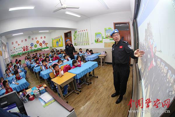 維和警察亓恒剛為青島市樺川路小學(xué)的師生們講述在利比里亞的執(zhí)勤任務(wù)。