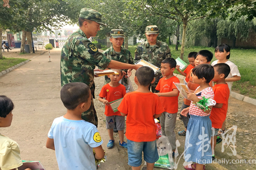 圖為秦皇島公安邊防支隊卸糧口邊防派出所官兵為孩子們分發書本