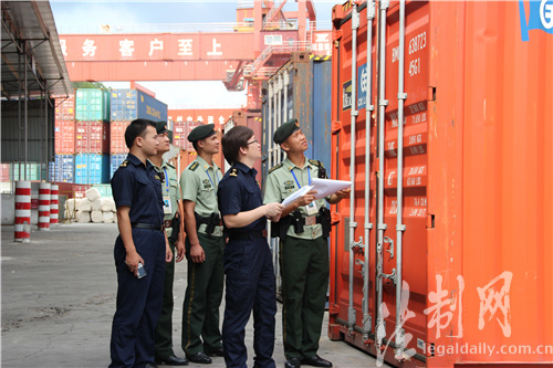 圖為邊檢官兵與海關執法人員對貨柜進行核對