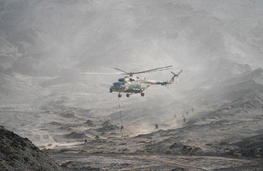 ????23日清晨,荒山丘陵遍布的庫爾勒訓練基地,某特戰旅特戰分隊乘坐直升機迅速向“恐怖分子”的營地機動,演練的第一個課目就這樣毫無征兆地打響。