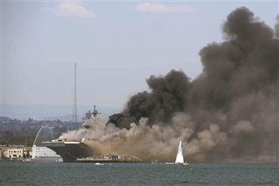 ????發生火災后,處于撲救滅火狀態的“好人理查德”號兩棲攻擊艦。