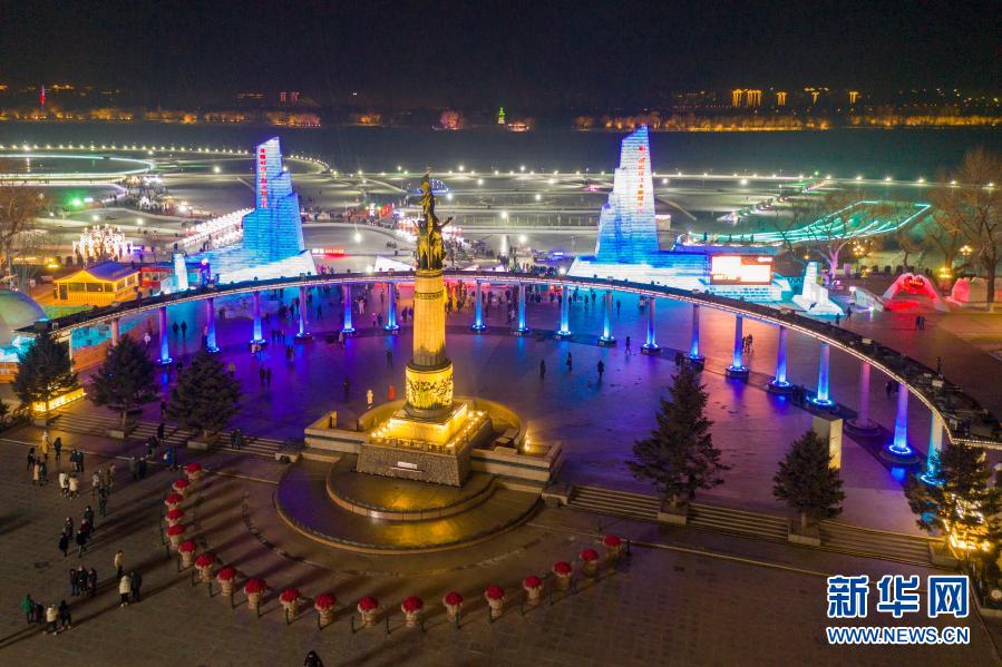 這是2021年1月1日拍攝的防洪紀念塔及哈爾濱松花江冰雪嘉年華(無人機照片)。