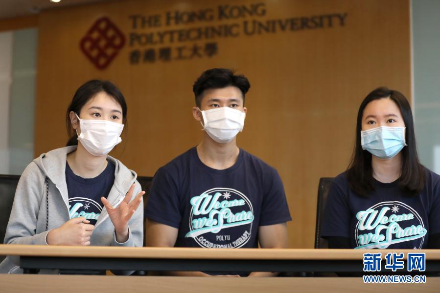 香港理大康復(fù)治療科學(xué)系職業(yè)治療學(xué)四年級(jí)學(xué)生李舒平、香港理大康復(fù)治療科學(xué)系職業(yè)治療學(xué)三年級(jí)學(xué)生李穎東、香港理大康復(fù)治療科學(xué)系職業(yè)治療學(xué)三年級(jí)學(xué)生梁熙童在接受新華社記者采訪(自左至右;2020年12月12日攝)。新華社記者 吳曉初 攝