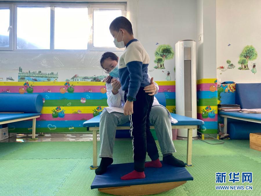 在哈爾濱博能中醫(yī)門診部,劉雨晴為腦癱兒童進(jìn)行康復(fù)訓(xùn)練(2月2日攝,手機(jī)照片)。