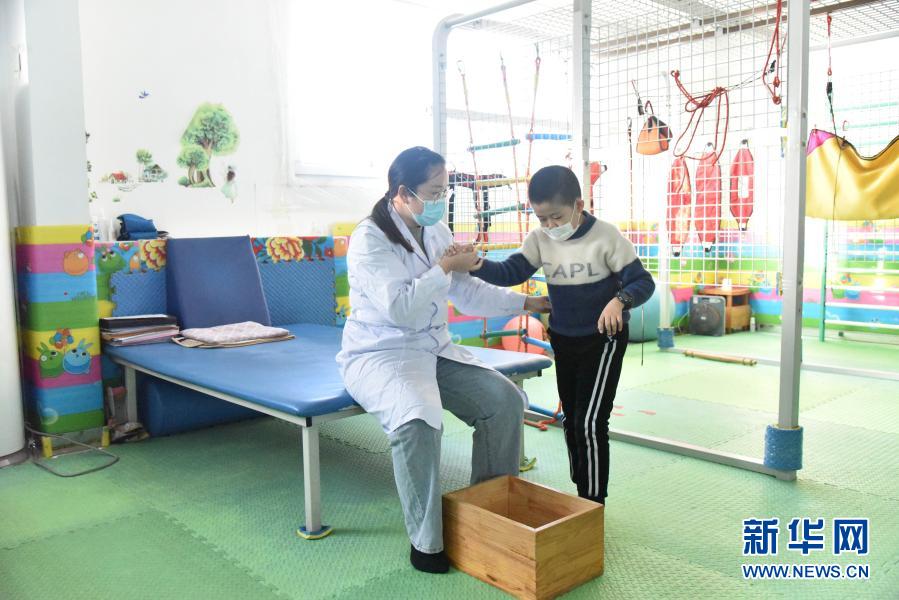 在哈爾濱博能中醫(yī)門診部,劉雨晴為腦癱兒童進行康復(fù)訓練(2月2日攝)。