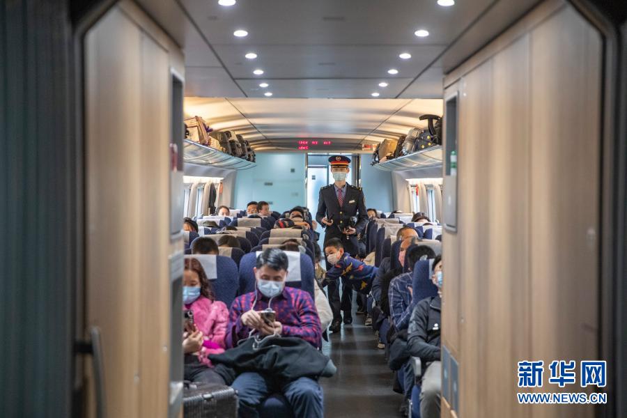 2月9日,付寶印在重慶北開往萬州北的C6422次列車上巡視車廂。新華社記者 黃偉 攝
