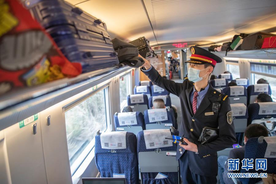 2月9日,在重慶北開(kāi)往萬(wàn)州北的C6422次列車(chē)上,付寶印在巡視車(chē)廂時(shí)為旅客調(diào)整行李架上的行李。新華社記者 黃偉 攝