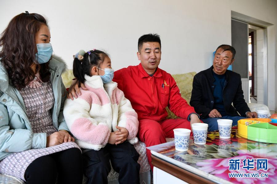 2月11日除夕當(dāng)天,王濤(右二)和妻子女兒走訪看望脫貧戶劉玉強(qiáng)(右一)。劉玉強(qiáng)家過(guò)去住的是土房,2017年脫貧并蓋了新房,2019年還開(kāi)起了農(nóng)家樂(lè)。