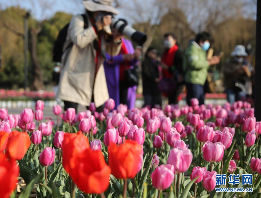 2月14日,游客在昆明市大觀公園拍攝盛開的郁金香。新華社發(梁志強 攝)